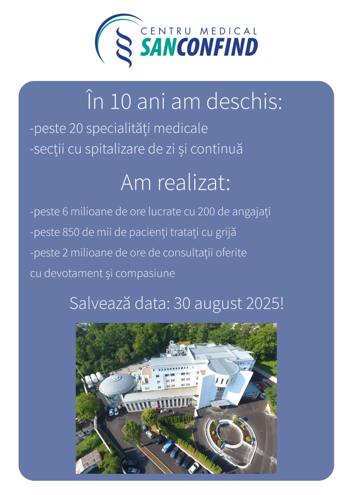 Sâmbătă, 30 august 2025, în localitatea Poiana Câmpina, județul Prahova, a avut loc un eveniment organizat de Centrul Medical Sanconfind, prilejuit de împlinirea a zece ani de activitate.